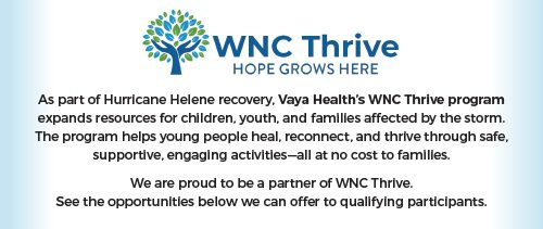 WNC Thrive works with multiple organizations, including PATH, to offer after-school, weekend, and summer camp programs to children and families recovering from Hurricane Helene in the 22 hurricane-affected counties Vaya serves.